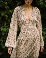 Cut from lightweight, fluid viscose that drapes beautifully against the figure, it features a relaxed silhouette cinched at the waist to create a subtle, flattering definition. The elegant V-neckline and sweeping long sleeves make it a versatile choice for transitional seasons.