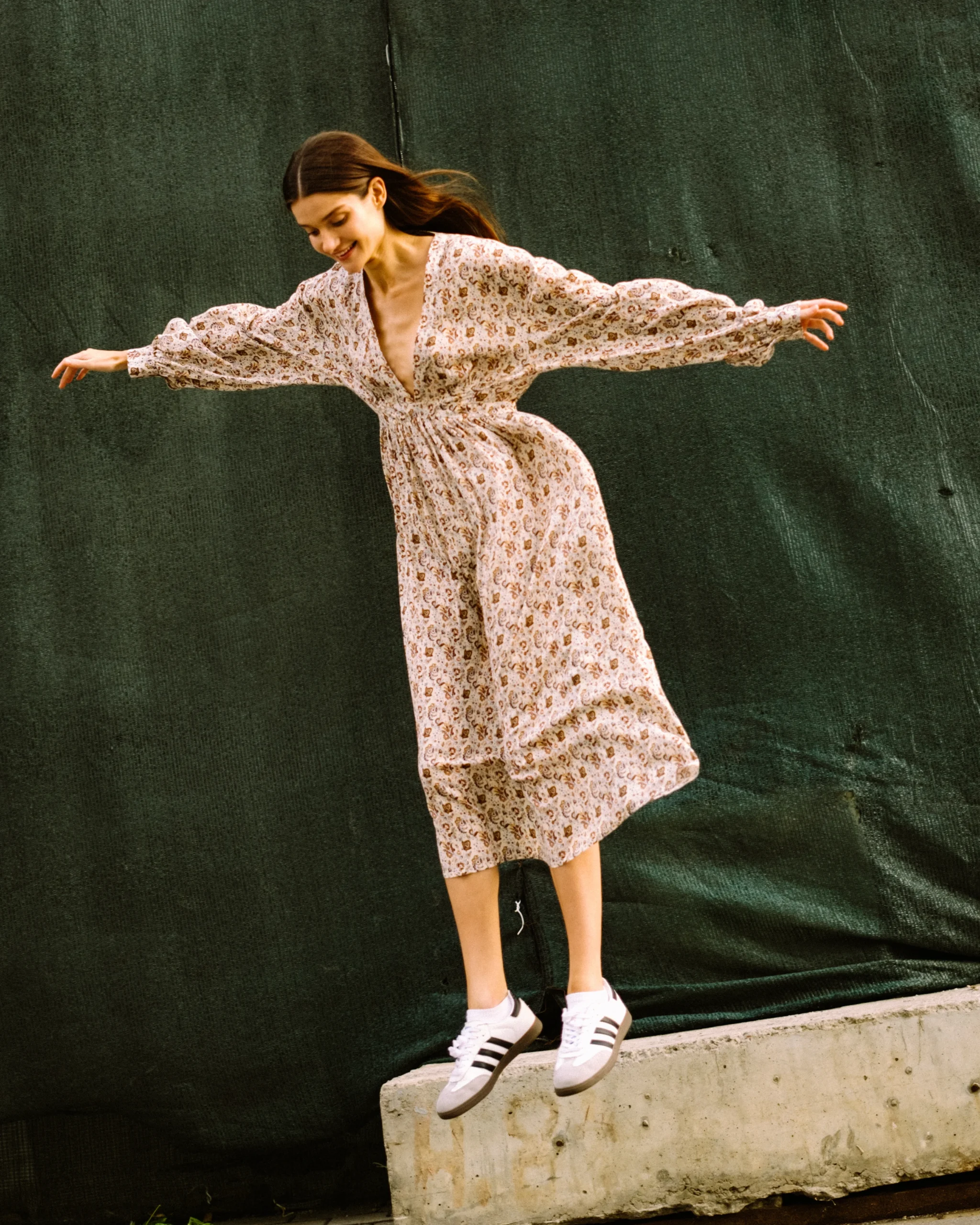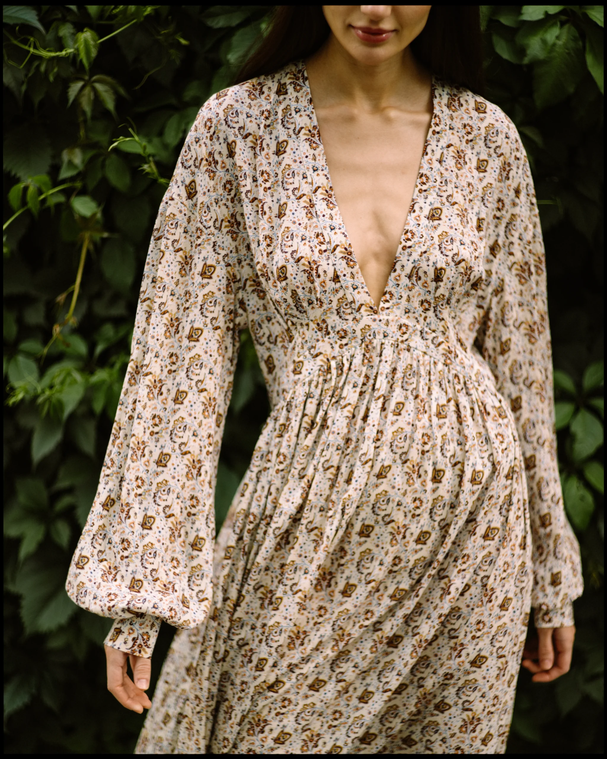 V-neck long-sleeved dress. Cut from lightweight, fluid viscose that drapes beautifully against the figure, it features a relaxed silhouette cinched at the waist to create a subtle, flattering definition.