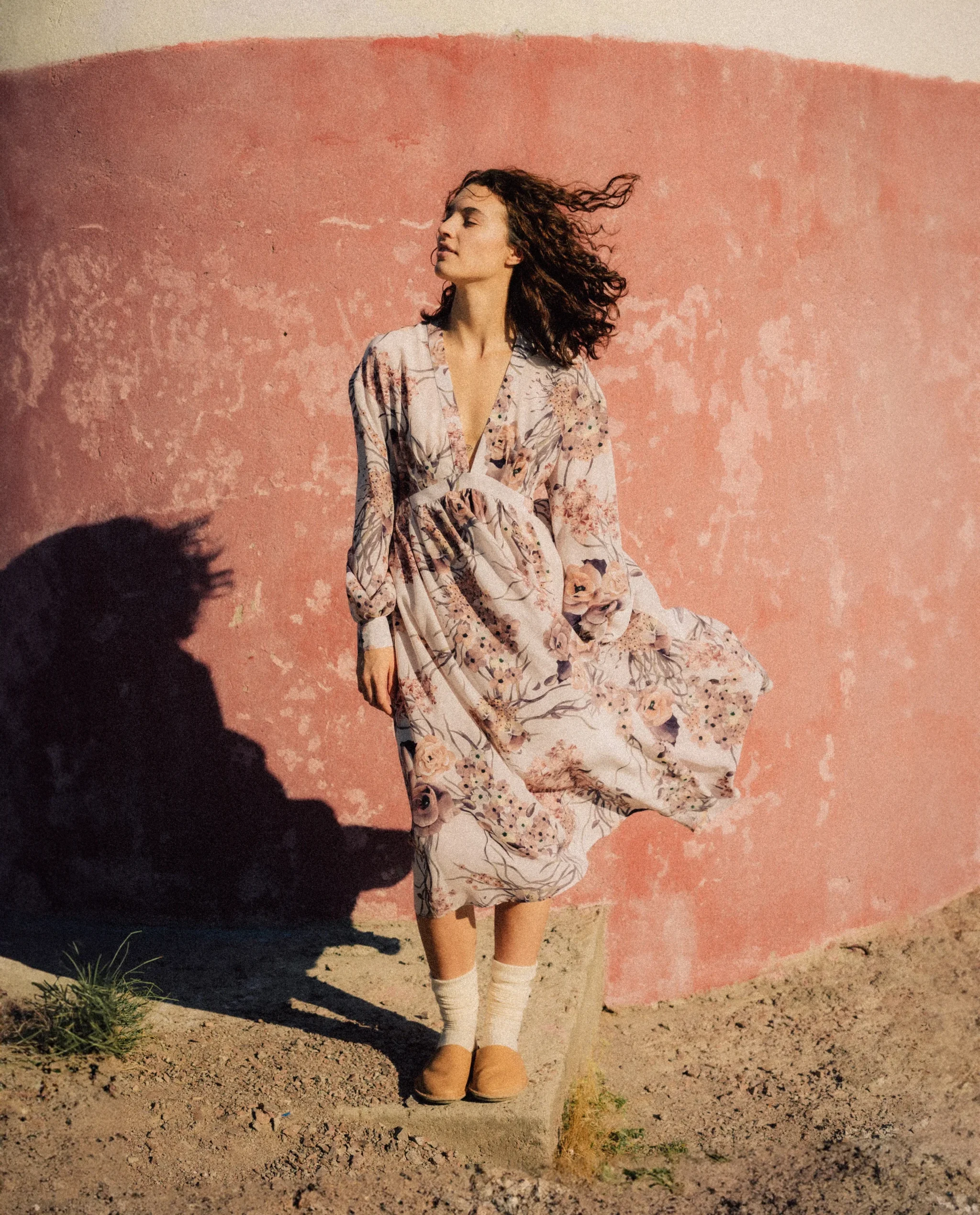This dress, crafted from weightless silk, is adorned with a unique hand-painted pattern that guarantees you’ll stand out every day. The silhouette perfectly combines lightness and elegance—voluminous sleeves and a loose fit, artfully accentuated at the waist, flatteringly accentuate the figure. The V-neckline perfectly frames the décolleté.