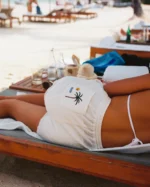 Crafted from cotton with a tactile waffle texture, these shorts are designed with an elasticated waistband for an easy, relaxed fit. The silhouette falls loosely away from the body, while the raw-edge finish adds a subtle sense of undone charm. A small embroidered detail at the back lends a refined, artisanal touch. Light and effortless, they feel especially suited to warm, slow summer days.